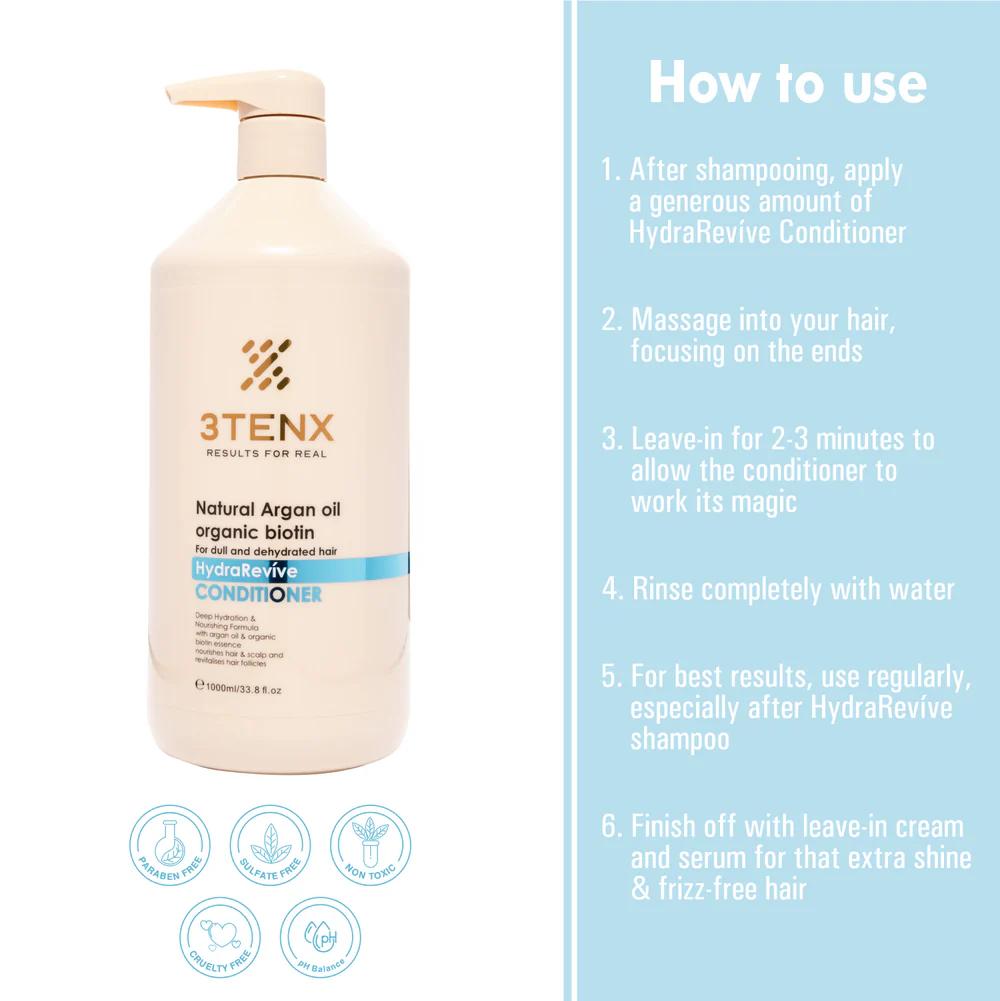 Unlock intense hydration with 3TENX HydraRevive Conditioner, specially formulated to nourish and revive dry, dehydrated hair. Enriched with Moroccan argan oil, vitamin E, omega-3 & 9 fatty acids, and biotin essence, this conditioner helps protect, hydrate, and improve hair manageability. Its lightweight yet deeply conditioning formula leaves hair soft, smooth, shiny, and frizz-free while enhancing overall hair health and vitality.