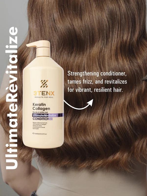 3TENX Ultimate Revitalize Conditioner is a nourishing solution designed for brittle, dry, and unmanageable hair. Infused with the powerful combination of keratin and collagen, it helps strengthen weakened strands, reduce frizz, and restore smoothness and shine. Keratin reinforces the hair structure, while collagen provides essential amino acids to revitalize hair from within. With regular use, it leaves hair softer, more manageable, and visibly healthier with improved resilience.
