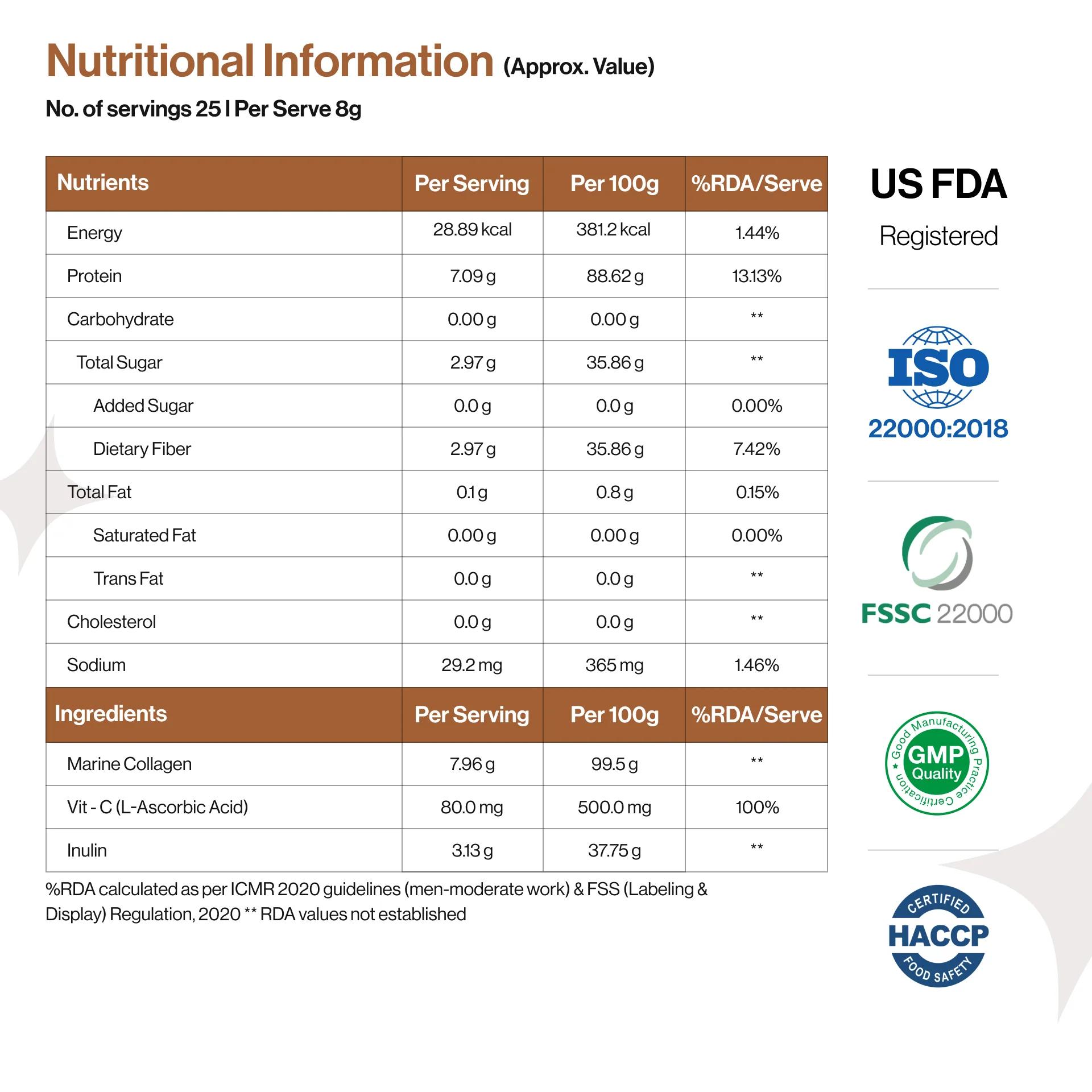 - L-Glutathione, Resveratrol, Hyaluronic Acid, Biotin, L-Ascorbic Acid (Vitamin C), Tocopherol (Vitamin E), Cyanocobalamin (Vitamin B12), Nicotinic Acid (Vitamin B3/Niacin), Inulin dietary Fibers, Stevia Herbal Sweetener