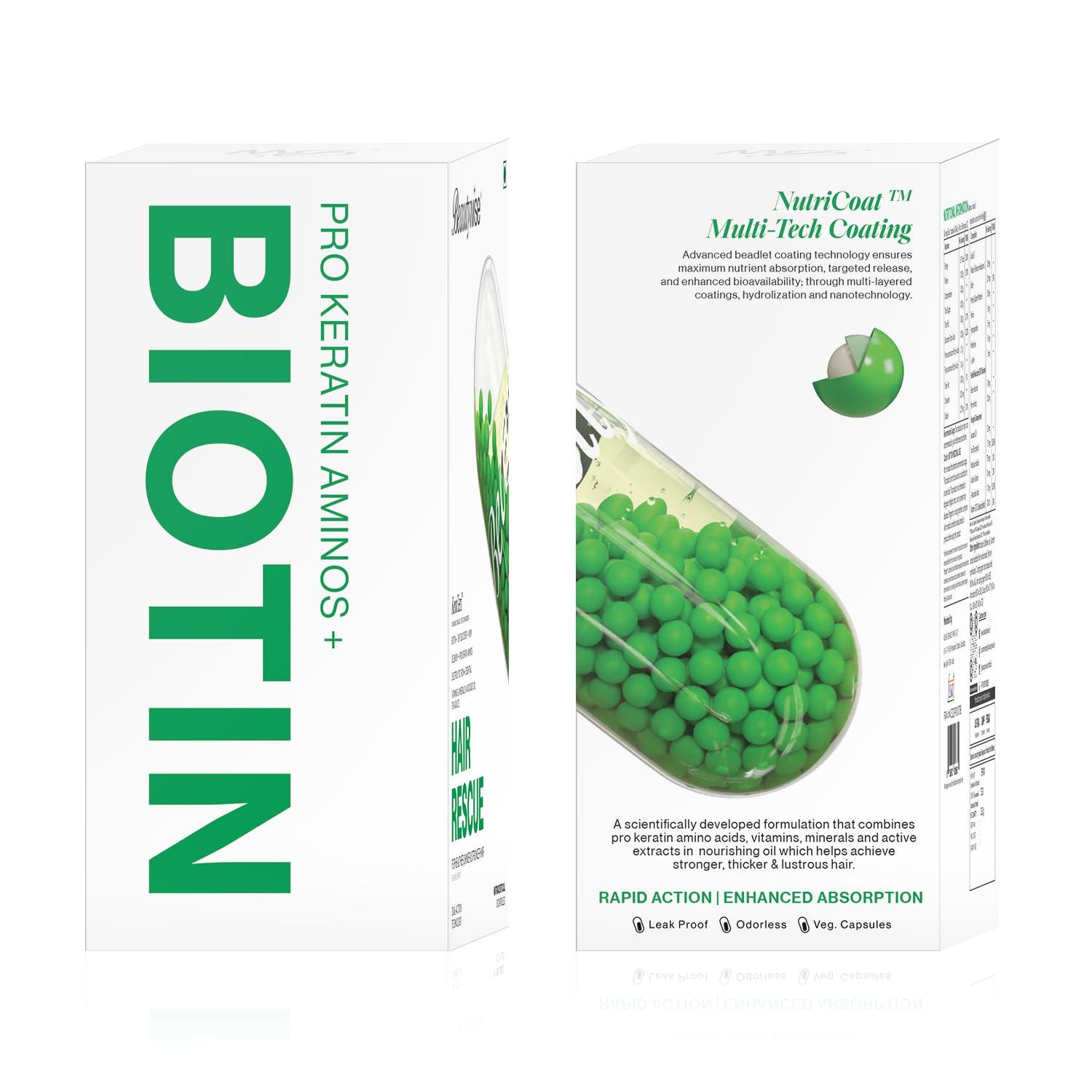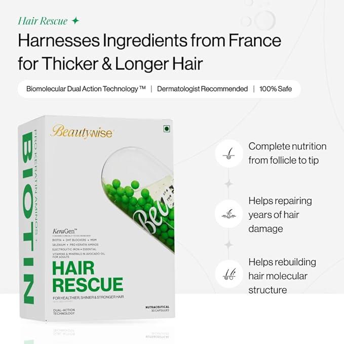 Nourish your hair from within with Beautywise HairRescue Capsules, a dual-action supplement scientifically formulated to reduce hair fall, promote regrowth, and improve scalp health. Powered by the KeraGen Complex and enhanced with Biotin, Pro-Keratin Amino Acids, and DHT Blockers, this advanced formula strengthens hair from root to tip while supporting a balanced scalp environment. With Biomolecular Dual-Action Technology, each capsule uses NutriCoat microbeadlet-in-oil delivery for superior nutrient absorption and gradual release, ensuring continuous nourishment throughout the day. Infused with Avocado Oil, MSM, and Vitamin C, it helps hydrate the scalp, restore hair structure, and promote thicker, fuller strands naturally. Clinically tested and dermatologist-recommended, Beautywise HairRescue is crafted in US-FDA–registered facilities, guaranteeing safety, purity, and efficacy.