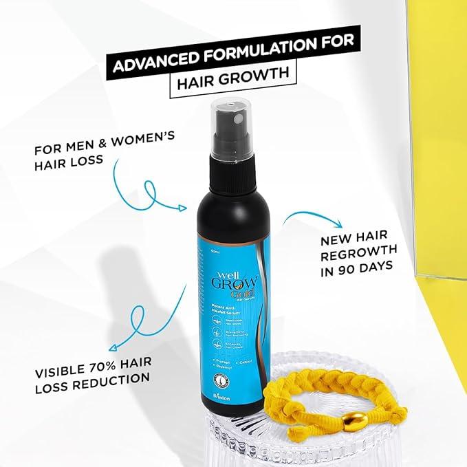 Well Grow Gold Anti-Hairfall Hair Serum is an advanced, high-performance formula designed to reduce hair fall and support visible hair regrowth. Powered by clinically proven actives such as Procapil, Capixyl, and Redensyl, it helps inhibit DHT activity, reactivate dormant hair follicles, and strengthen hair anchoring at the roots.