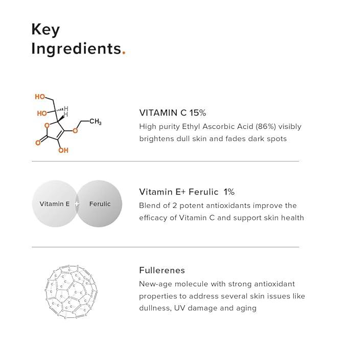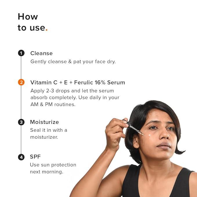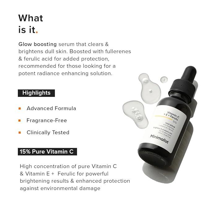 Minimalist 16% Vitamin C + E + Ferulic Acid Face Serum is a daily skin-brightening serum designed to improve uneven skin tone, enhance radiance, and protect the skin from environmental damage. Formulated with 16% Ethyl Ascorbic Acid (a stable Vitamin C derivative), along with powerful antioxidants like Vitamin E, Ferulic Acid, and Fullerenes (C60), this serum targets dullness, dark spots, and signs of ageing. Its lightweight, non-comedogenic formula makes it suitable for all skin types.