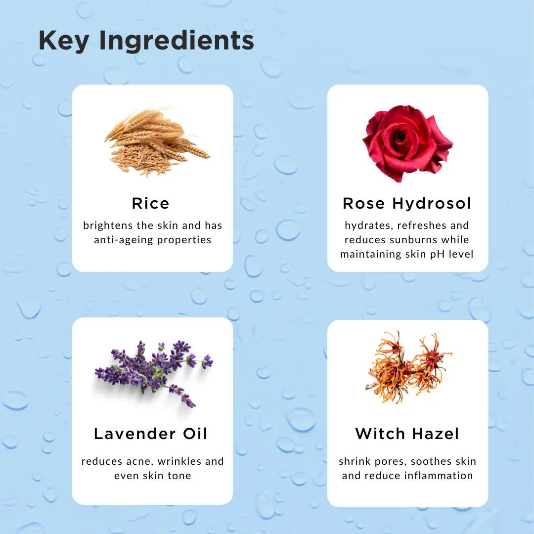 - Aqua, Rice Extract, Rose Flower Hydrosol, Witch Hazel Extract, Geogard ECT (Benzyl Alcohol (and) Salicylic Acid (and) Glycerin (and) Sorbic Acid), EDTA, Lavender Essential Oil, Allantoin