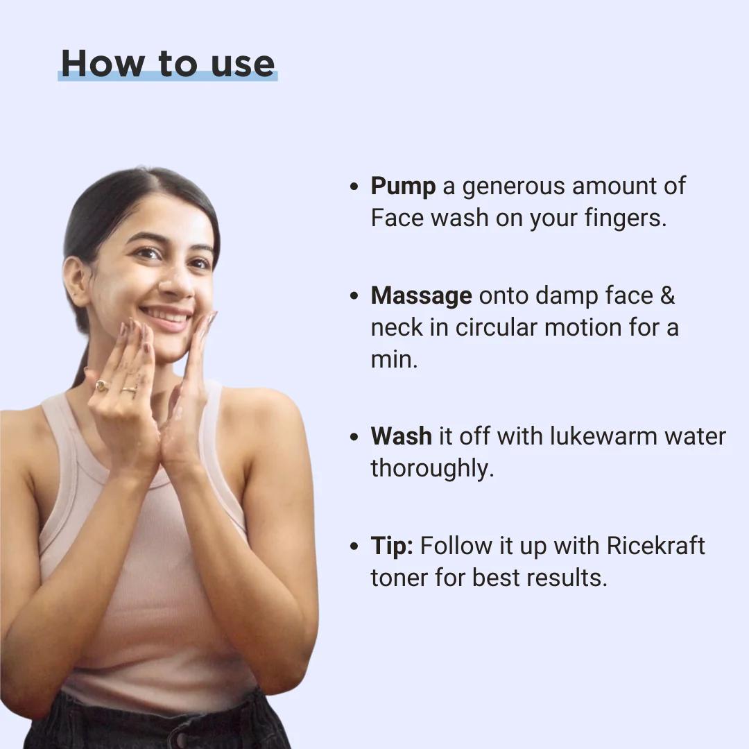 Dispense: Take a small amount of RiceKraft Rice Water Face Wash onto your wet face.