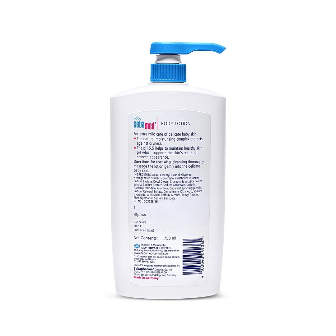Take 2-3 ml of Sebamed baby lotion on your palm and gently massage it over your entire body to soften your baby’s skin