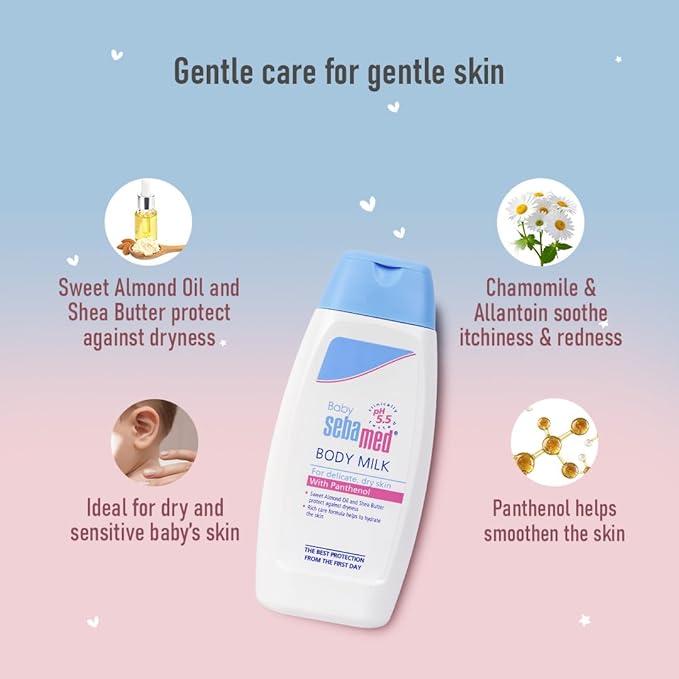 Sebamed Baby Body Milk Lotion (100 ml) is a dermatologist-developed daily moisturizer specially crafted for babies with dry and sensitive skin. With a pH of 5.5, it promotes the development of the skinβs natural protective barrier while providing deep hydration. The natural lipid complex with Sweet Almond Oil and Shea Butter nourishes and protects delicate skin, while Panthenol and Allantoin smooth, soften, and relieve itchiness or redness. Its non-greasy, fast-absorbing texture leaves your babyβs skin soft, supple, and comfortable. The compact 100 ml size is perfect for travel or regular daily use.