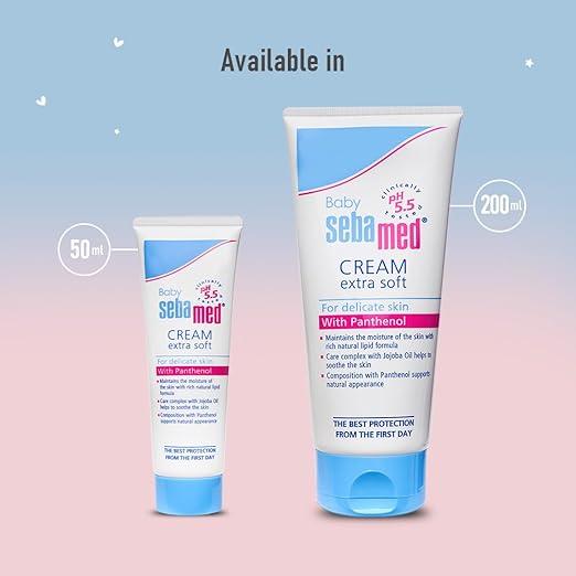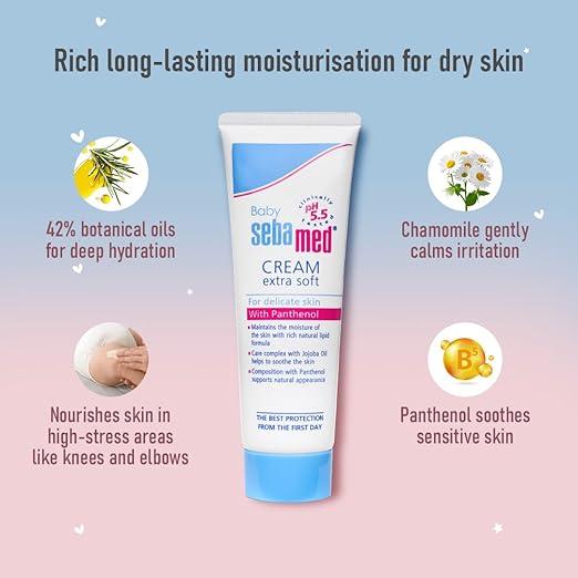 Sebamed Baby Cream Extra Soft (50 ml) is a dermatologist-developed, clinically tested cream that provides intensive protection and care for your babyβs sensitive skin. With a pH of 5.5, it supports the natural skin barrier and helps prevent dryness. Formulated with 42% natural lipids, Panthenol, Jojoba Oil, Allantoin, and Chamomile extract, it nourishes and soothes delicate skin while promoting healing in high-stress areas like knees, legs, and elbows. Its non-greasy, easily absorbed formula makes it perfect for daily use, especially for babies with atopic or sensitive skin. The 50 ml size is ideal for travel and quick use.