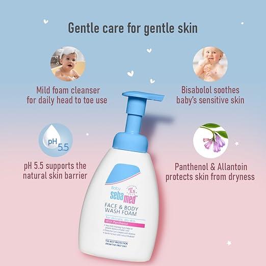 Sebamed Baby Face & Body Wash Foam is a mild, foam-based daily cleanser specially designed for delicate and dry baby skin.