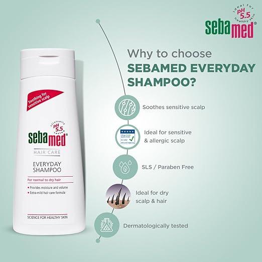 Sebamed Everyday Shampoo is a gentle, soap-free shampoo formulated for normal to dry hair. With a pH of 5.5, it protects the natural barrier of the scalp and hair while providing mild daily cleansing. Dermatologically tested and free from SLS, phthalates, parabens, and other harsh toxins, it nourishes hair, maintains structural integrity, and enhances shine, leaving hair soft, healthy, and manageable. Suitable for men and women, this shampoo is ideal for everyday use.