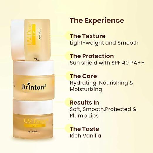 UV Doux Lip Lightening Balm combines sun protection and deep hydration to care for your lips daily. With SPF 40 PA++, it shields delicate lips from harmful UVA/UVB rays while nourishing them with Almond Oil, Olive Oil, Shea Butter, and Vitamin E. This dermatologist-approved formula helps restore natural lip color, repairs chapped lips, and leaves them soft, smooth, and healthy-looking. A subtle vanilla flavor adds a touch of indulgence to your daily lip care routine.