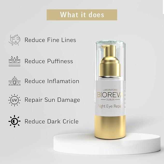 Bioreva Night Eye Repair Cream is an advanced overnight treatment formulated to address dark circles, puffiness, fine lines, and dullness around the delicate eye area. This age-correction formula combines antioxidant protection, hydration, gentle exfoliation, and collagen support to help restore a brighter and firmer eye contour. It features Multisal Dark Circle Eliminator with encapsulated Caffeine and Shea Butter to reduce puffiness and dark circles, while Multisal Multilayer with Lactic Acid, Phenylethyl Resorcinol, and Palmitoyl Tripeptide-5 supports collagen production and smooths fine lines. Multisal Vitamin C & E provide antioxidant defense and brightness, and Hyaluronsan HA-LQ-RB delivers deep hydration and improves elasticity. With regular nighttime use, this cream helps refresh and revitalize tired-looking eyes.