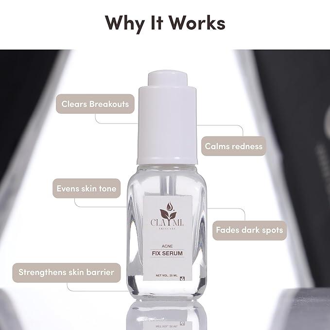 Claymi Acne Fix Face Serum is a lightweight, water-based gel designed to effectively target acne, reduce scars, and control excess oil. Suitable for oily, acne-prone, combination, and sensitive skin, it works gently yet efficiently to improve overall skin clarity.
