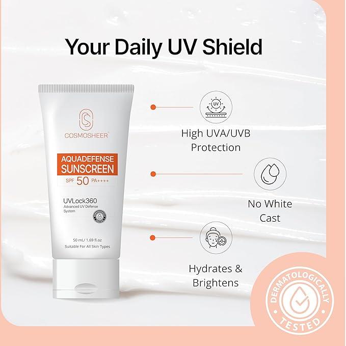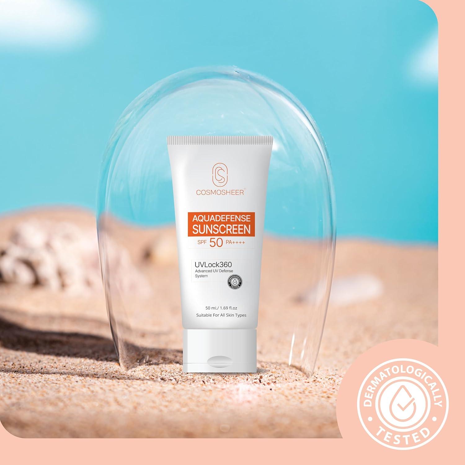 Cosmosheer Aquadefense UVLock 360 Sunscreen SPF 50 PA++++ 50 ml | Lightweight, Non-Greasy, No White Cast | For All Skin Types
