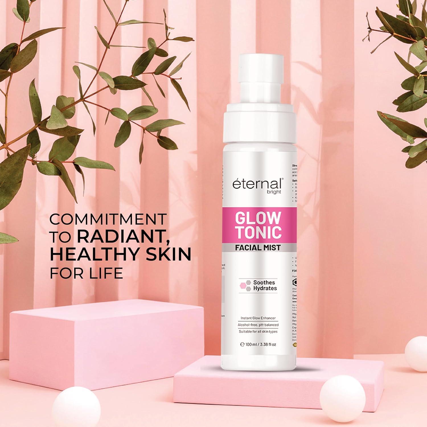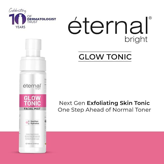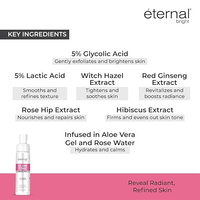Eternal Bright Glow Tonic Exfoliating Facial Toner Mist is an alcohol-free and pH-balanced facial mist formulated to refresh dull-looking skin while gently exfoliating, hydrating, and soothing for a visible glow boost. Powered by Glycolic Acid 5% and Lactic Acid 5%, it helps exfoliate the skin and improve the appearance of uneven skin tone. The formula is enriched with Witch Hazel to help refine skin texture and Red Ginseng to energize and revitalize tired-looking skin.