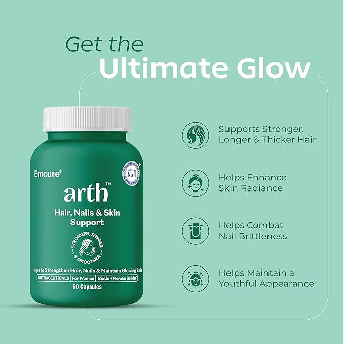 Powered by clinically researched plant-based biotin and essential vitamins, Arth Biotin Capsules support inside-out beauty and nourishment. Manufactured by Emcure Pharmaceuticals in GMP-certified facilities, they combine scientific innovation with nature’s best ingredients—helping you achieve stronger hair, healthier skin, and radiant confidence.