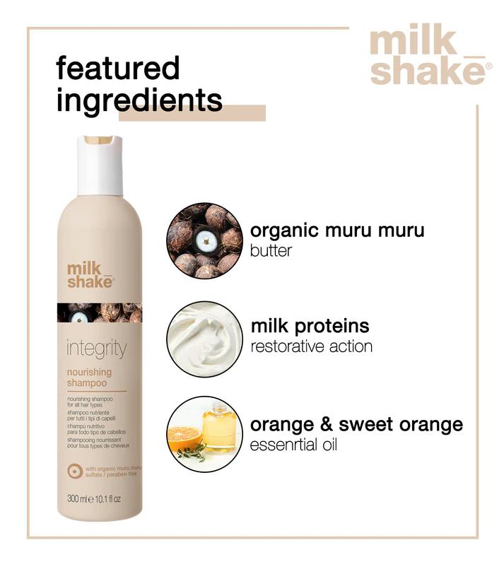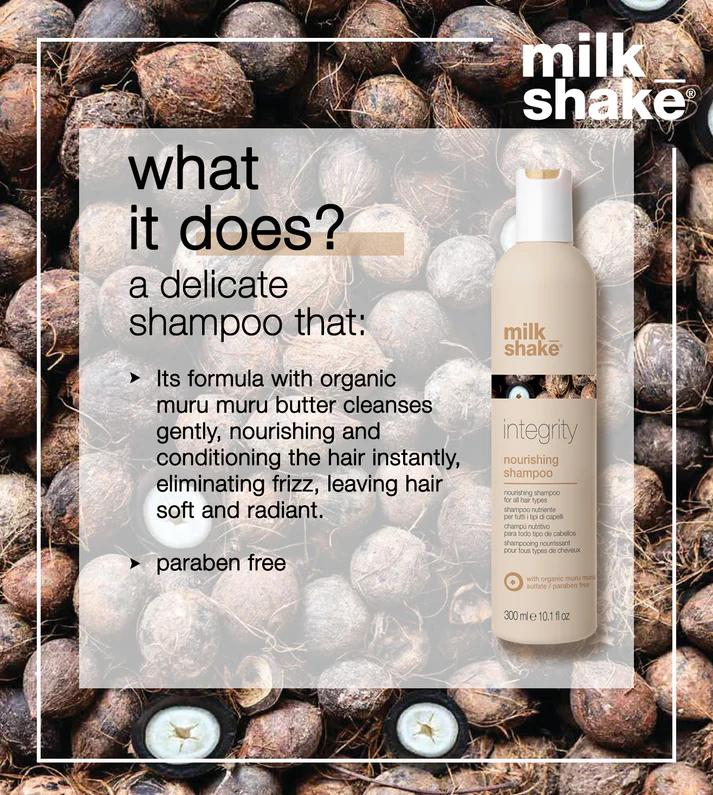 Milkshake Integrity Nourishing Shampoo is a sulfate- and paraben-free formula that gently cleanses and nourishes hair. Infused with organic muru muru butter, it helps maintain hair color while providing deep hydration. This shampoo eliminates frizz, leaving hair soft, shiny, and radiant. Ideal for damaged or dry hair, it restores vitality and strength with a blend of natural ingredients and amino acids. Perfect for promoting long-lasting hair health and beauty.