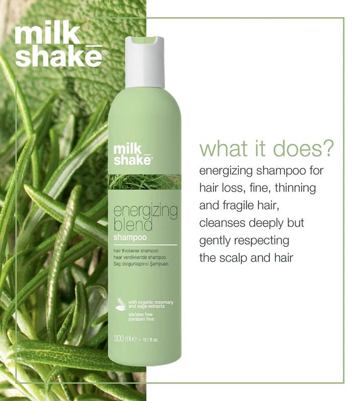Milkshake energizing blend shampoo is for fine, thinning and fragile hair, cleanses deeply but gently while respecting the scalp and hair. The natural powers in organic rosemary, sage and fioravanti balm extract purifies hair while stimulating the scalp’s micro-circulation to create an optimal environment for new hair growth. The blend of botanical extracts and special conditioners invigorates the hair stem and gives softness. Panthenol provides more density to the hair, and essential oils and eucalyptus instil a pleasant energizing feeling, leaving the scalp refreshed.