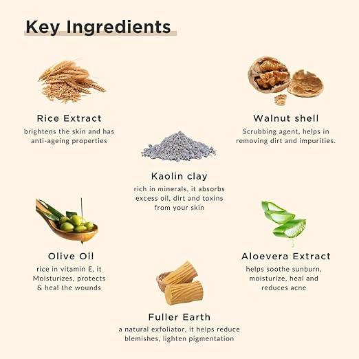 - Aqua, Kaolin Clay, Fuller's Earth, Cetyl Alcohol, Cocamidopropyl Betaine (CAPB), Glycerin, Aloe Vera Leaf Extract, Oryza Sativa (Rice) Extract, Walnut Shell Powder, Emulsifying Wax, Coconut Oil, Sunflower Seed Oil, Olive Fruit Oil, Geogard ECT, Witch Hazel Leaf Extract, Rose Hydrosol, Glyceryl Stearate, Titanium Dioxide, Vitamin E, Xanthan Gum, EDTA
