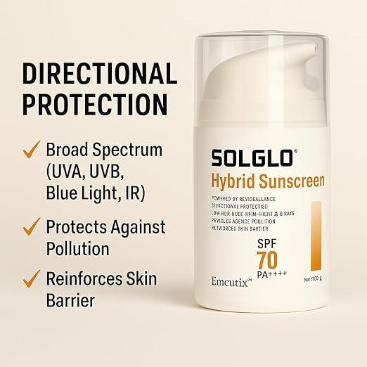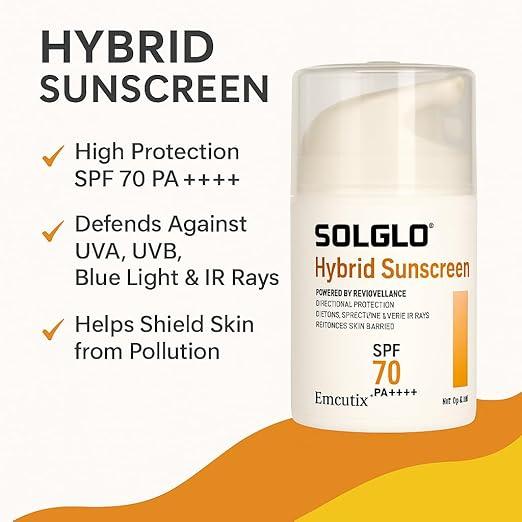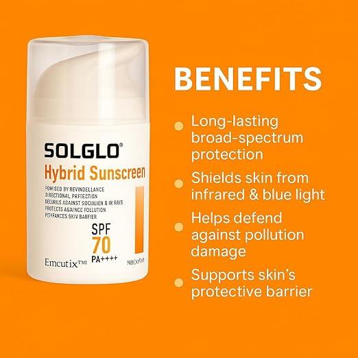 Protect your skin from daily sun exposure and environmental stress with SOLGLO Hybrid Sunscreen SPF 70 PA++++. Its advanced broad-spectrum formula shields against UVA and UVB rays, blue light from digital screens, and urban pollution. Enriched with Zinc Oxide, Titanium Dioxide, Avobenzone, and Niacinamide, this hybrid sunscreen strengthens the skin barrier while providing lightweight, fast-absorbing coverage with a smooth, non-whitening finish. Ideal for everyday use, it safeguards your skin against sunburn, premature aging, and environmental damage.