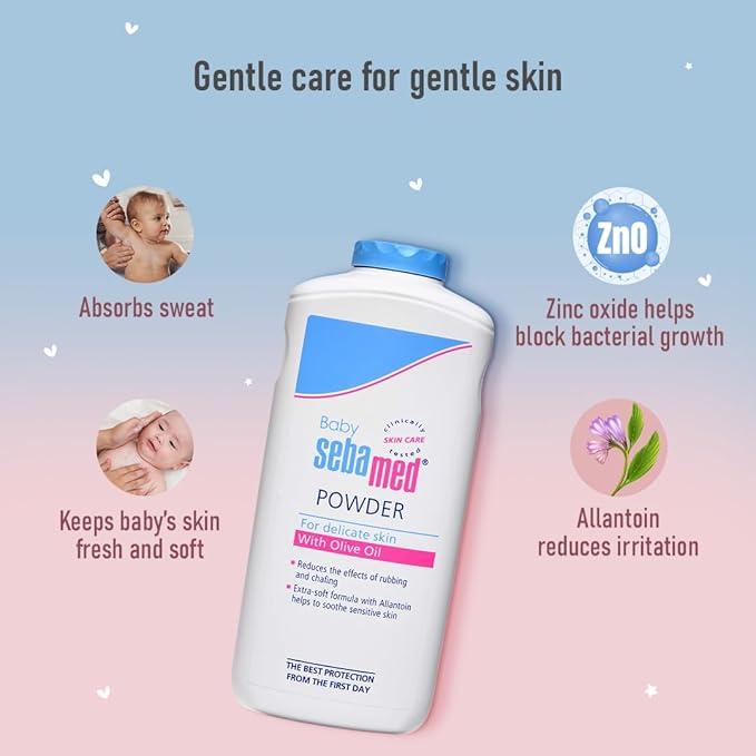 Sebamed Baby Powder (400 gm) is a family-size pack specially formulated to provide long-lasting comfort and freshness for your babyβs delicate skin. Made in Switzerland and tested by dermatologists, it combines Talc, Zinc Oxide, Olive Oil extract, and Allantoin to absorb excess sweat, reduce irritation, and nourish sensitive skin. Its gentle, botanical fragrance keeps babies feeling fresh, while its pH 5.5 formulation helps support the skinβs natural protective barrier. Perfect for parents looking for economical daily care, this large pack ensures your baby stays comfortable and protected throughout the day.