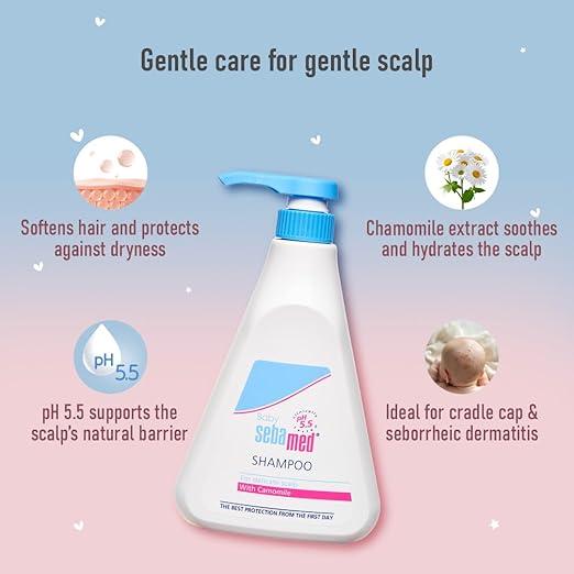 Sebamed Baby Shampoo is a family-size, dermatologist-developed shampoo that provides long-lasting gentle care for babyβs delicate scalp and hair. With pH 5.5, it supports scalp health and promotes strong, healthy hair growth. Its soap-free and alkali-free formula ensures excellent skin tolerance, while Chamomile extract soothes, hydrates, and prevents dryness. The tear-free formula makes bath time stress-free, leaving hair soft, shiny, and easy to comb.