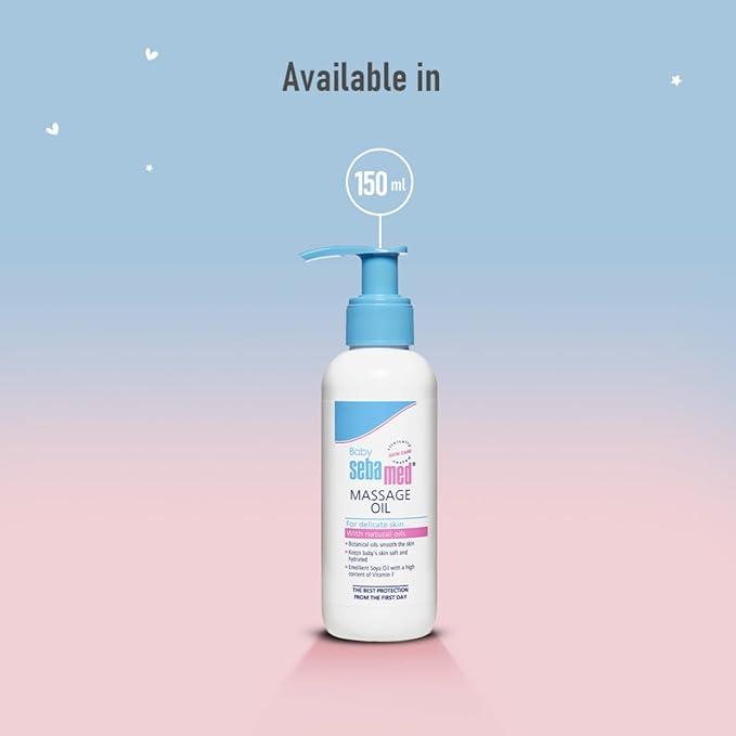 Sebamed Baby Massage Oil (150 ml) is a 100% botanical, non-sticky massage oil designed for the gentle care and protection of newborns and babiesβ sensitive skin. Developed by dermatologists, this nourishing oil is made with 95% Soy Oil, rich in essential fatty acids and Vitamin F, which ensures optimal hydration and skin tolerability. Enriched with 5% Wheat Germ Oil, one of the richest natural sources of Vitamin E, it helps protect and soften delicate skin while preventing dryness. The oilβs superior spreadability and fast absorption make massages soothing and comfortable, leaving your babyβs skin soft and supple without any greasy residue. Safe and effective from day 7 of birth, it is free from mineral oils, colorants, and irritants that can cause allergic reactions.