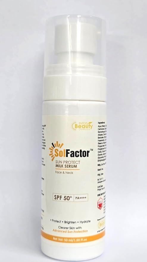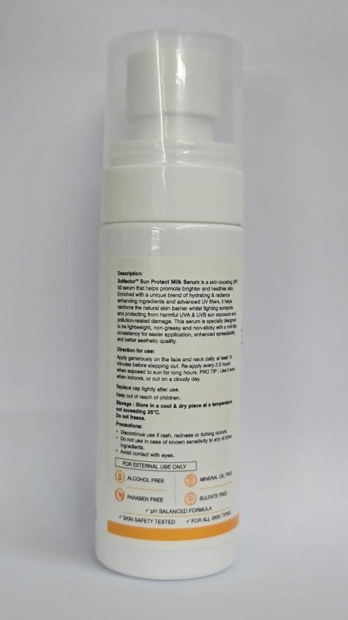 Solfactor Sun Protect Milk Serum SPF 50+ PA++++ is an advanced, dermatologist-tested sunscreen serum that provides powerful protection against harmful UVA and UVB rays. Its lightweight, non-greasy formula glides smoothly onto the skin, offering a radiant, hydrated finish without any white cast. Designed to defend against sun damage and pollution, this serum also reinforces the skin’s natural barrier while keeping it soft, bright, and healthy. Perfect for daily indoor and outdoor use, it absorbs quickly, leaving the skin smooth and comfortable all day long.