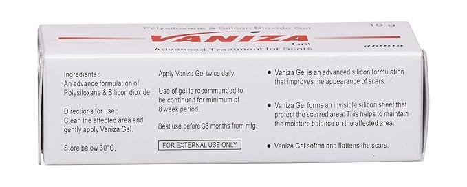 Vaniza Gel is an advanced silicone-based formulation designed to reduce the appearance of acne scars, surgical scars, and other marks. Enriched with polysiloxane and silicone dioxide, it helps soften, flatten, and smooth scars while maintaining optimal skin hydration. The gel forms an invisible protective silicone layer over the affected area, which locks in moisture and shields the skin from external irritants. Its quick-drying, non-sticky, and transparent texture makes it perfect for everyday use. With consistent application, Vaniza Gel visibly improves skin texture, tone, and comfort—helping you achieve a clearer, more even-looking complexion.