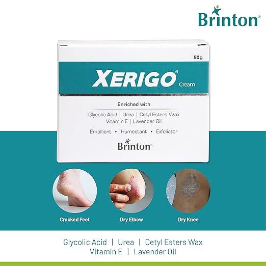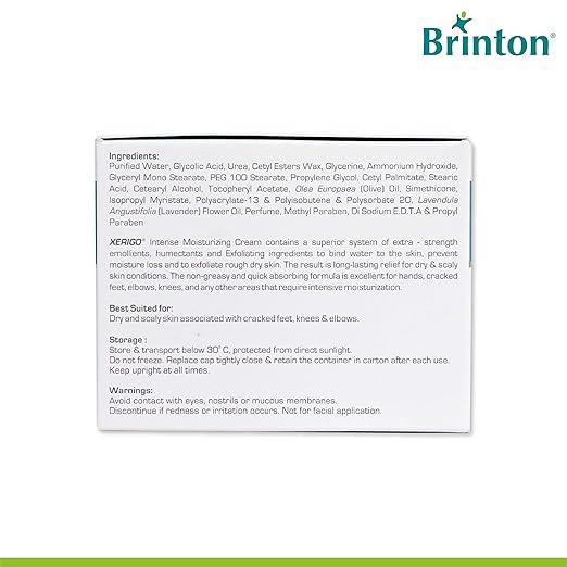Brinton Xerigo Intense Skin Moisturizing Cream is specially formulated to nourish and repair dry, rough, and scaly skin. Enriched with a blend of extra-strength emollients, humectants, exfoliating ingredients, Vitamin E, and Lavender Oil, it deeply hydrates, prevents moisture loss, and gently exfoliates rough skin, leaving it soft, smooth, and supple. Ideal for cracked feet, elbows, and knees, Xerigo’s quick-absorbing, non-greasy formula ensures long-lasting moisturization with a soothing fragrance.