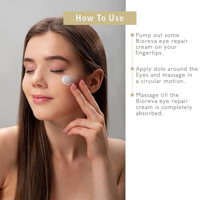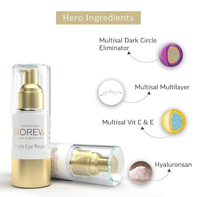 Bioreva Night Eye Repair Cream is an advanced overnight treatment formulated to address dark circles, puffiness, fine lines, and dullness around the delicate eye area. This age-correction formula combines antioxidant protection, hydration, gentle exfoliation, and collagen support to help restore a brighter and firmer eye contour. It features Multisal Dark Circle Eliminator with encapsulated Caffeine and Shea Butter to reduce puffiness and dark circles, while Multisal Multilayer with Lactic Acid, Phenylethyl Resorcinol, and Palmitoyl Tripeptide-5 supports collagen production and smooths fine lines. Multisal Vitamin C & E provide antioxidant defense and brightness, and Hyaluronsan HA-LQ-RB delivers deep hydration and improves elasticity. With regular nighttime use, this cream helps refresh and revitalize tired-looking eyes.