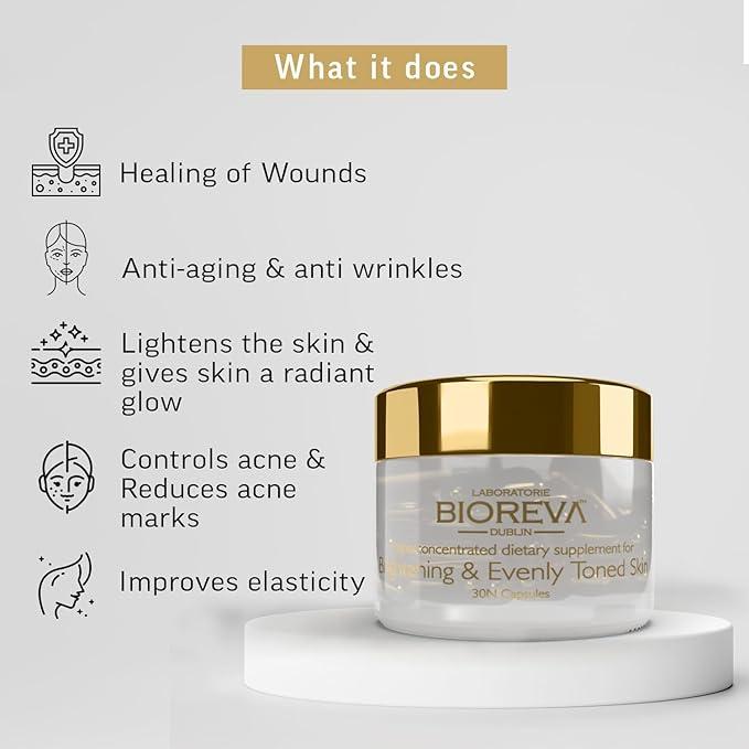 Bioreva Radiacap Skin Brightening Supplement Capsule is a concentrated dietary formula designed to support brighter, more even-toned, and healthier-looking skin from within. This advanced supplement works to reduce pigmentation, dullness, and visible signs of aging while enhancing overall skin clarity. It is enriched with L-Glutathione, a powerful antioxidant that supports detoxification and promotes radiant skin; Alpha Lipoic Acid, which aids cellular energy production and provides antioxidant protection; and Astaxanthin, a natural carotenoid known for its anti-aging, anti-inflammatory, and skin-protective benefits. With regular use, this formulation helps improve skin elasticity, refine pores, reduce hyperpigmentation, and protect against environmental damage, leaving skin smoother, clearer, and more luminous.