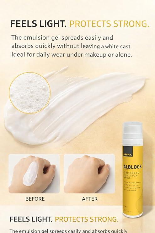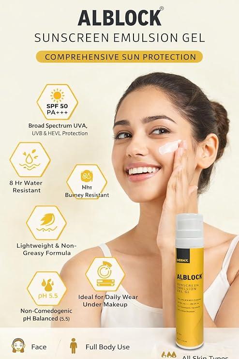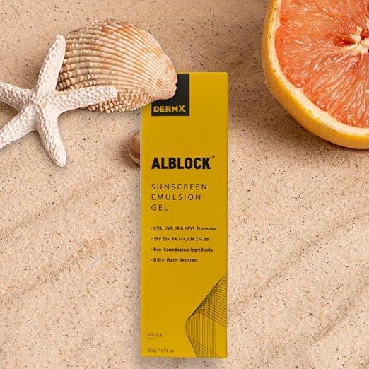 DERMX ALBLOCK Sunscreen Emulsion Gel SPF 50 PA+++ | UVA, UVB, IR & HEVL Protection | 50 g