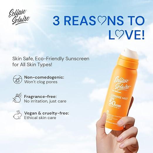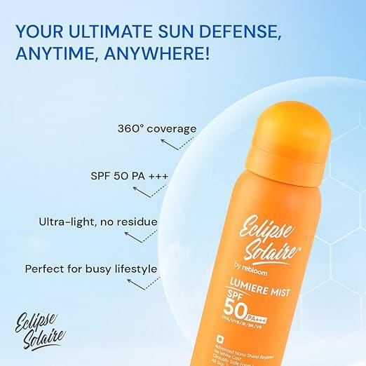 Eclipse Solaire Lumiere Mist Sunscreen Spray SPF 50 PA+++ is a high-performance, ultra-lightweight sunscreen designed to deliver powerful broad-spectrum protection against UVA and UVB rays. The fine mist application ensures even coverage with a refreshing, non-greasy finish that absorbs quickly without leaving a white cast.