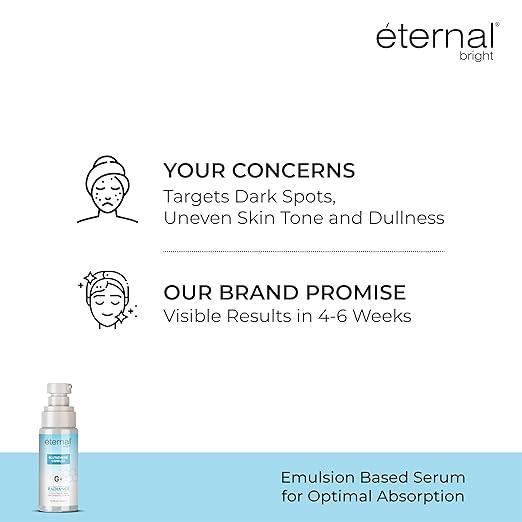 Eternal Bright Glutathione Complex G+ Radiance Skin Brightening Serum is a powerful brightening serum designed to promote a clearer, more radiant, and even-looking complexion. The formula combines high-performance ingredients including Glutathione 3%, Vitamin C 10%, Niacinamide 5%, and Alpha Arbutin 2% to help enhance skin glow and improve the appearance of uneven tone and dark spots. Antioxidants such as Ferulic Acid 1% and Tocopheryl Acetate (Vitamin E) help support skin radiance and protection. Hydrating ingredients like Hyaluronic Acid 1%, D Panthenol, Betaine, and sugar-based humectants help maintain moisture and skin comfort. Gentle exfoliation from Lactic Acid 5% helps smooth the look of skin texture, while nourishing botanicals including Aloe Vera Leaf Extract, Simmondsia Chinensis (Jojoba) Seed Oil, and Prunus Amygdalus Dulcis (Sweet Almond) Oil help keep the skin soft and healthy-looking with regular use.