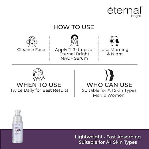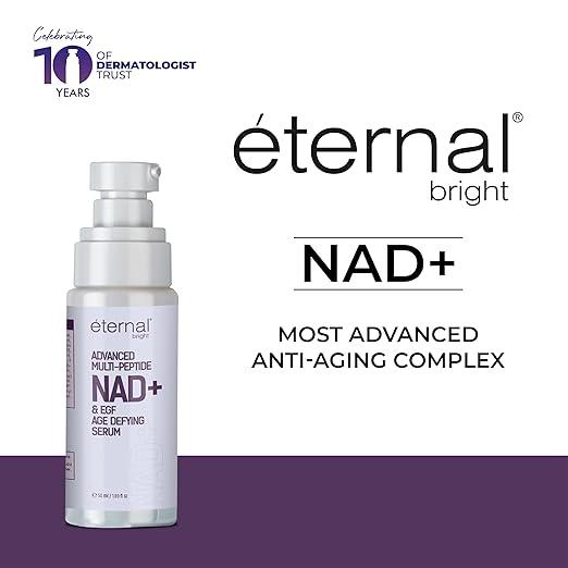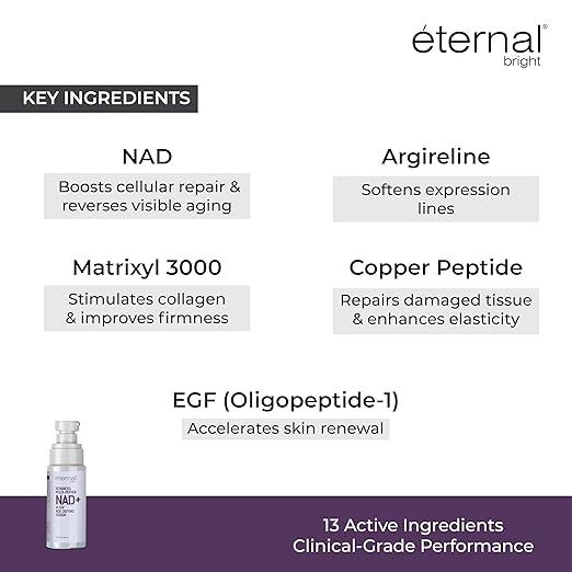 Eternal Bright Advanced Multi-Peptide NAD+ & EGF Age-Defying Serum is an advanced anti-aging face serum designed to help improve skin elasticity and reduce the appearance of early signs of aging for a smoother and firmer-looking complexion. The formula combines skin-repairing hydrators, barrier-supporting lipids, and multi-peptide technology to support overall skin health and radiance. Powered by Niacinamide and NAD+ (Niacinamide Adenine Dinucleotide), it helps promote a brighter and healthier-looking appearance.