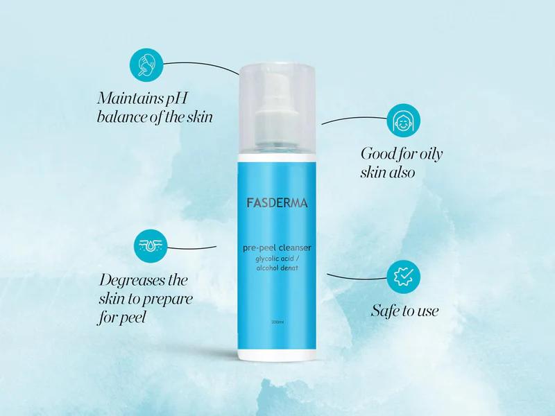 Fasderma Pre-Peel Skin Cleanser is a specialized pre-treatment cleansing solution formulated to thoroughly remove dirt, excess oil, and surface impurities. Enriched with glycolic acid and witch hazel, it gently exfoliates the skin, helps refine pores, and improves overall skin texture while maintaining optimal moisture balance. Designed to prepare the skin before chemical peels or active skincare procedures, this cleanser enhances the penetration and effectiveness of subsequent treatments, supporting clearer and smoother-looking skin.
