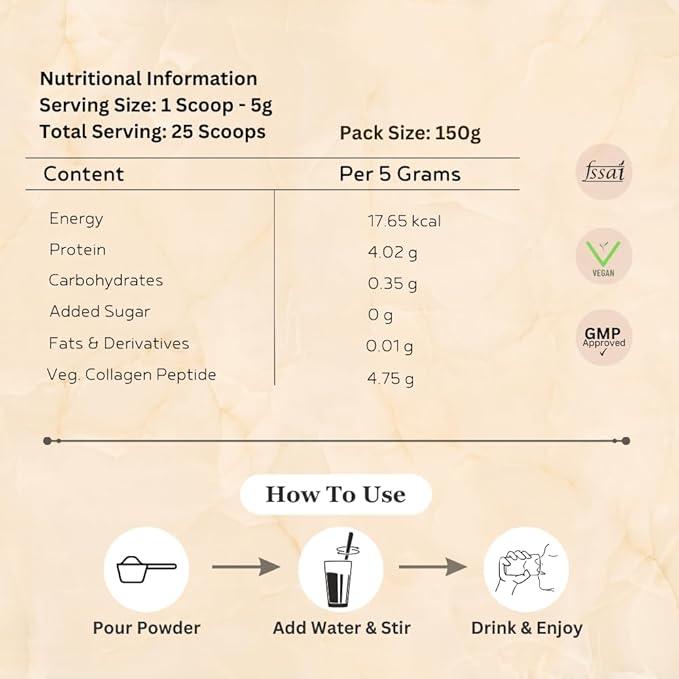 - Veg Collagen Peptides derived from Broccoli Extract, Daucus Carota (Carrot) Extract, and Papain Enzyme to support natural collagen production and overall skin health.