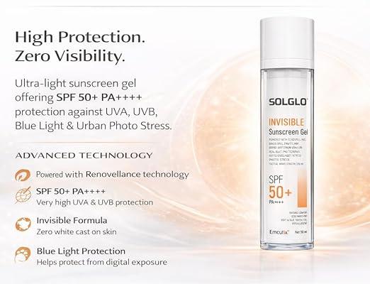 Solglo Invisible Sunscreen Gel SPF 50+ PA++++ is a broad-spectrum gel sunscreen designed to provide advanced protection against UVA, UVB, blue light, and environmental photo-stressors. It is especially suitable for oily, acne-prone, and sensitive skin, helping prevent sun damage, premature aging, and pigmentation.
