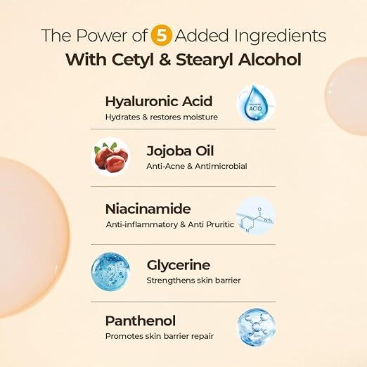 - Sodium Hyaluronate, Jojoba Oil, Niacinamide, Panthenol, Aqua, Glycerin, Cetearyl Alcohol, Sodium Cocoyl Isothionate, Disodium EDTA, Phenoxyethanol, Ethylhexylglycerin.